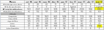 Curioso este segundo mês de utilização. Excelente número de utilizadores para estudar. Contributo valioso da iniciativa Pilhas de Livros para a leitura presencial. 725 utilizadores na informática...relação direta sem dúvida com o tempo de verão que se fez sentir e levou os alunos para os espaços exteriores (?)...
